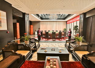 酒店定位为高性价比豪华主题餐饮酒店,以悠久的帝都历史和博大精深的河洛文化为载体,巧妙融入牡丹文化,并通过工艺品、名家书画、诗词、碑刻、石雕、水系景观等方式,充分体现出洛阳的文化精髓,使“宴天下”品牌一跃成为帝都新贵。随着五部观光电梯在三楼缓缓停下,在门打开的同时,一个居于繁华之上的大隐之境展现于眼前。尊崇阔丽的酒店大堂彰显着皇家风范,别具一格的宴会前厅显得通达敞亮;漫步至三层的多功能宴会厅里, 6.8米高的无柱大厅显得异常的高大宽广、富丽堂皇,独有58平米LED全彩高清背景屏、触控星光大道、专业级舞美、多通道数字音响、特技电脑灯光、高清实况转播等,让我们感受到前卫科技与时尚生活完美结合所带来的震撼。
