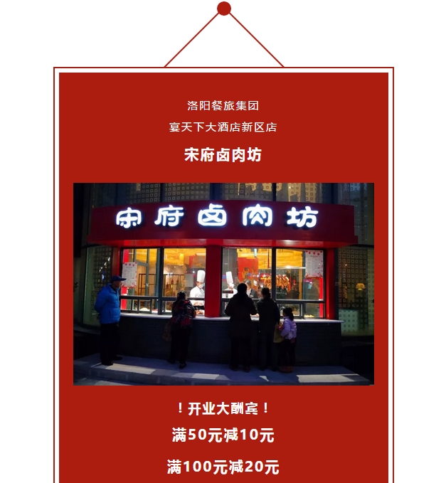 宋府卤肉坊新店开业!满50立减10元 以此类推! 发布时间:2017-11-25来源:点击:2391 洛阳餐旅 宴会专家全国预订客服热线:400-616-3939微信号:hacyly股票代码:836977长按二维码识别后添加关注以上信息来源于洛阳餐旅集团官网:www.socalsmarthome.com 分享到:0 用手机看 拍下二维码,信息随身看 试试用微信扫一扫,在你手机上继续观看此页面。 上一篇:中国收藏家协会副会长许诺军等一行考察洛阳旅发集团旗下华夏喜庆文化博物馆 下一篇:美国中华艺术收藏家协会会长曹鑫参观考察洛阳旅发集团旗下华夏喜庆文化博物馆