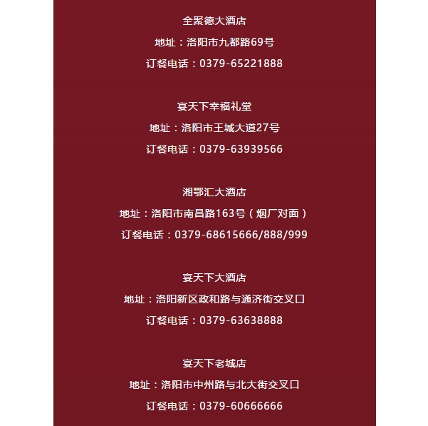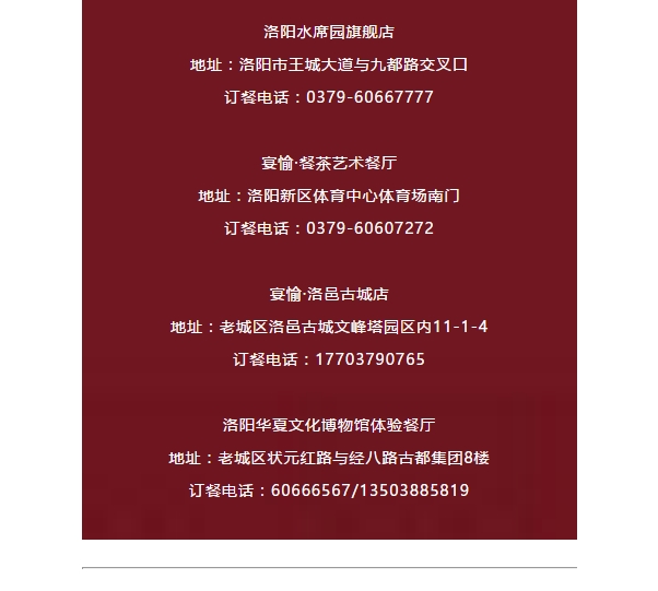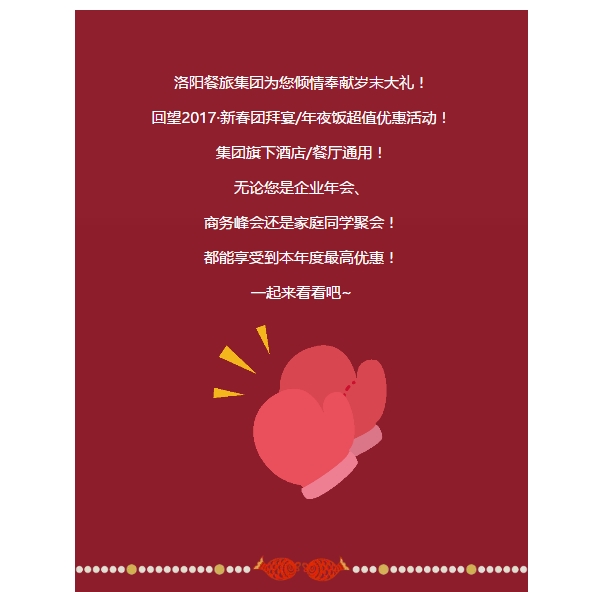 洛阳餐旅集团旗下酒店 团拜宴 | 年夜饭火热预定中······ 发布时间:2017-11-28来源:点击:2421 洛阳餐旅 宴会专家全国预订客服热线:400-616-3939微信号:hacyly股票代码:836977长按二维码识别后添加关注以上信息来源于洛阳餐旅集团官网:www.socalsmarthome.com 分享到:0 用手机看 拍下二维码,信息随身看 试试用微信扫一扫,在你手机上继续观看此页面。 上一篇:宴愉一周岁了!感恩回馈生日趴 海鲜泡饭9.9元!超多优惠等您来! 下一篇:中国食品安全报编辑部主任张基廷等一行参观考察洛阳旅发集团旗下华夏喜庆文化博物馆