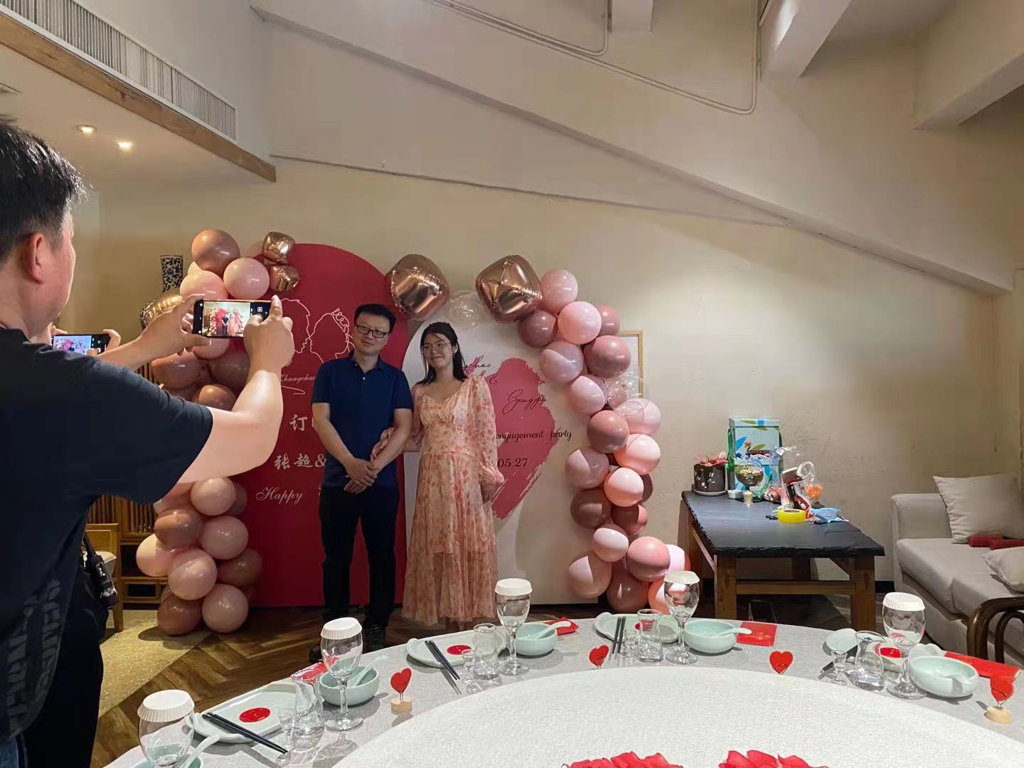 周四,迎着初夏还不太炙热的太阳,我开始了新一天的工作。点名期间得知今天中午“沁园春”是一个订婚宴,于是我们便准备给这对幸甜蜜的小情侣一份惊喜。我们先拿来事先买来的玫瑰花在转盘中间摆出一颗爱心,又用粮食画写上订婚的日期和这对情侣的姓氏,使得今天这个日子更加有纪念意义。接着,我们又跟***先来到酒店的客人一起用粉色气球对房间进行装饰,使整个房间的气氛显得的温馨而又浪漫。随后,在给主家摆酒水的时候我发现他们的袋子里装的有喜字,于是,我便提议将这些喜字摆在餐台装饰,这样即增加了用餐的氛围,又做到了买来的物品二次利用,主家也对我们的提议非常赞同。
