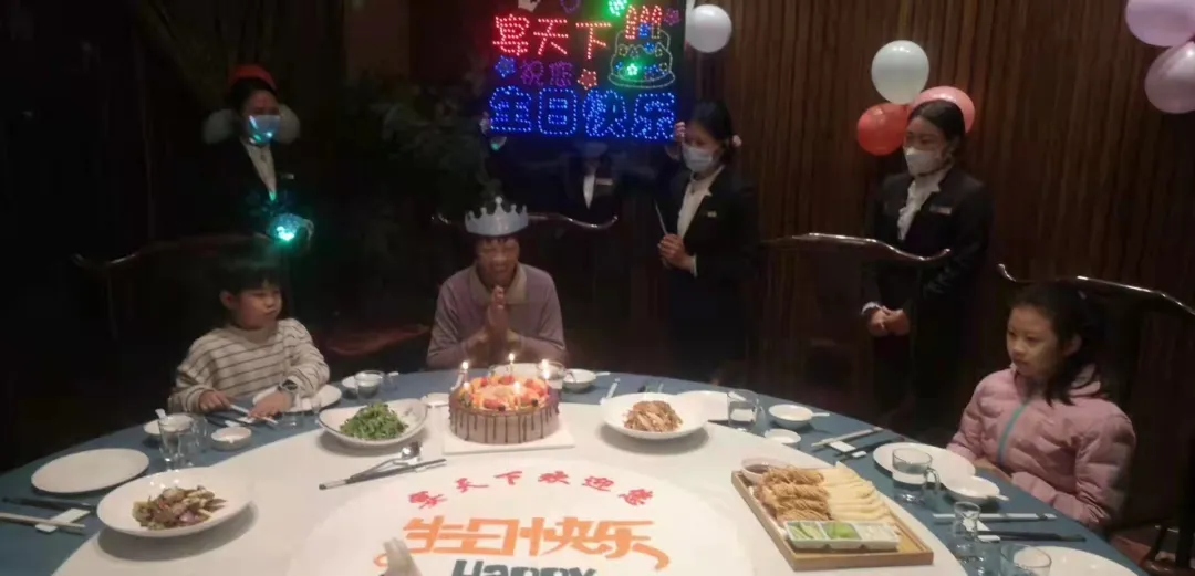 开餐前在客人的示意下,我们带上灯牌进了房间唱起了生日歌,李老太太感动的许下了愿望,接着吹灭了蜡烛。这时有位小朋友开口了,说了一句:“祝奶奶福如东海寿比南山,长命百岁!”这话一出,一桌子人都乐了,老太太也夸奖他真聪明!在其乐融融的气氛中用餐进入尾声,客人临走时还不停的对我们表示感谢!